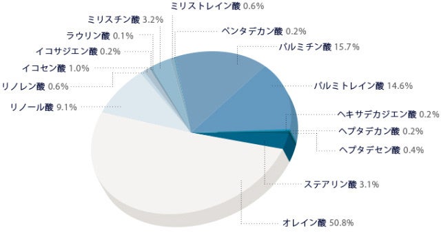 ミンクオイルには、高度不飽和脂肪酸であるパルミトオレイン酸、オレイン酸が多く含まれています。これらは人間の体を覆う皮脂膜の主要成分です。