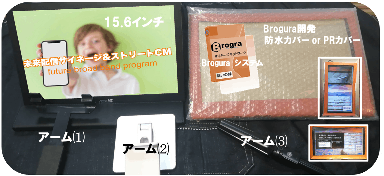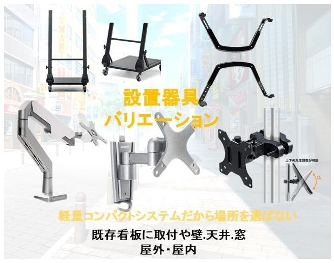 Answer::既存の看板に接続してシステム利用や既存外看板に+Brogra セットで合体利用 や小型 DS の利点 隙間や空きスペースに設置 更にモニターの重さ800g前後ですのでスタンドで利用も可能、脱着も持運びも楽々なので Brogra の機能と合わせ場所を選ばない自由自在にご利用頂けます。