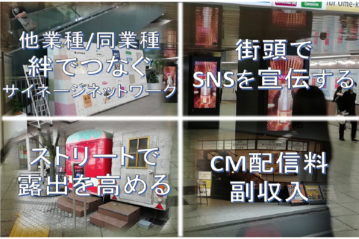サイネージから SNS にアクセス 自分の店の宣伝をしながら他社の CM を配信すると副収入が生まれる。