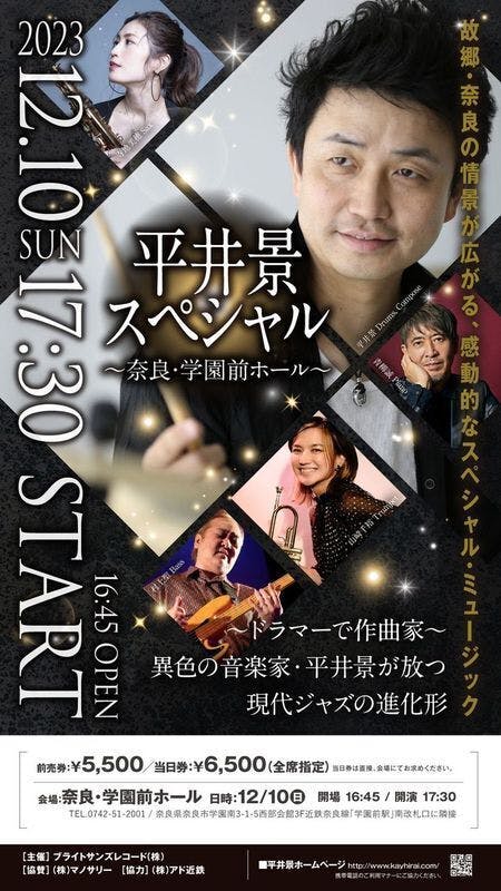 2022/11/16 18:01だいぶ秋めいてきましたね。気が付けば、今年も残り2ヵ月を切りました。アルバム『Something Jazzy~メロディ・イン・ザ・リビングルーム』のリリースから、4ヵ月。ツアーも、無事終了しました。良い作品が出来ましたのも、皆さまのお力を頂いたものと深く感謝しております。年末は、この作品の作曲とサウンドプロデュースを務めた、ドラマーの平井景さんのコンサートが、東京と奈良で開催されます!毎年、秋から冬にかけて開催する、恒例のコンサート。私も舞台監督として1からプロデュースして参ります。因みに、昨年の2021年11月26日、奈良・学園前ホールでのコンサートをダイジェストPVです! 最初から最後まで楽しい!元気をもらえます。「ジャズって、難しそう、、」という方、心配ご無用です。そして、そして今年は、まずタイトルがコレ!↓平井景スペシャル・Concert Tour 2022 ~Changing~な、なんと、副題に「Changing」という名が。。これは、あの『Something Jazzy~メロディ・イン・ザ・リビングルーム』にも収録の曲名がついています!という事は、、、。そう、皆さまにご支援頂いたCDからもお届けする予定なんです。CDとは、また一味も違うアレンジ、演奏。一期一会の貴重な瞬間を味わえる事間違いなしです。是非是非、お見逃しなく♪会場で私を見かけたら、声をかけてくださいね。現在、東京/奈良公演とも、チケット絶賛販売中です。全席指定ですので、どうぞお早めに。お待ちしております。■平井景スペシャル・Concert Tour 2022 ~Changing~出演:平井景(Drums, Compose)、榊原大(Piano)、山崎千裕(Trumpet)、寺地美穂(Sax)、西谷牧人(Cello)、村上聖(Bass)▼▼▼▼▼【東京公演】2022年12月6日(火)座・高円寺2(03-3223-7500 / 東京都杉並区高円寺北2-1-2)→JR中央線高円寺駅北口を出て徒歩5分■open 18:00 / start 18:45(~20:30終演予定)■チケット料金:¥5,000(全席指定)▼▼▼▼▼【奈良公演】2022年12月25日(日) 学園前ホール(0742-51-2001 / 奈良県奈良市学園南3-1-5西部会館3F)→近鉄奈良線「学園前駅」南改札口に隣接■open 16:45 / start 17:30(~19:30終演予定)■チケット料金:¥5,000(全席指定)==================【ネット購入】ブライトサンズレコード公式サイトhttps://www.brightsunsrecord.com/【銀行振込】event@kayhirai.com※「メール」で公演日、申込枚数、代表者氏名、連絡先をご明記ください※返信メールで銀行口座をお知らせ⇒入金確認後、座席番号をメールいたします【詳細】平井景ホームページhttp://www.kayhirai.com/▼▼▼▼▼2022年を締めくくる、豪華ホール・コンサート2公演!ドラマーで作曲家、異色の音楽家が送るオリジナルの世界 ━━━━NHK「美の壺」、NHKラジオ「まいにちスペイン語」など多くの番組音楽を手がけ、奈良「春日大社」「天河神社」での奉納コンサートなど、独自路線で活躍するドラマー平井景が、クラシック~ジャズで名を馳せる超豪華ミュージシャンと、熱く、美しく、楽しい、特別なコンサートを開催します。毎年恒例のホール・コンサート、本拠地の東京 (12/6) と、故郷の奈良 (12/25) のみの限定公演。“六重奏”で魅せるアーティスト達の共演!この機会をお見逃しなく!・・・・全ては移ろう、移りゆく。そこにも、”希望”を感じて。心に響くメロディをお届けします。 もっと見る