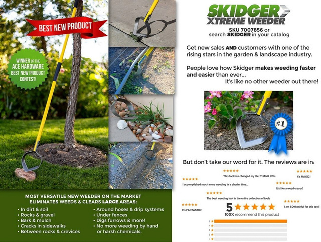 庭の除草は大変で面倒な雑用であり、できれば誰もやりたくはありませんよね。しかし、SKIDGERはそれを変えます!あえて言うと「楽しくて簡単」になりました。お庭、菜園などの除草作業を、短時間で完了するようユーザーを強く後押しするアメリカ生まれのガーデニングツールです。