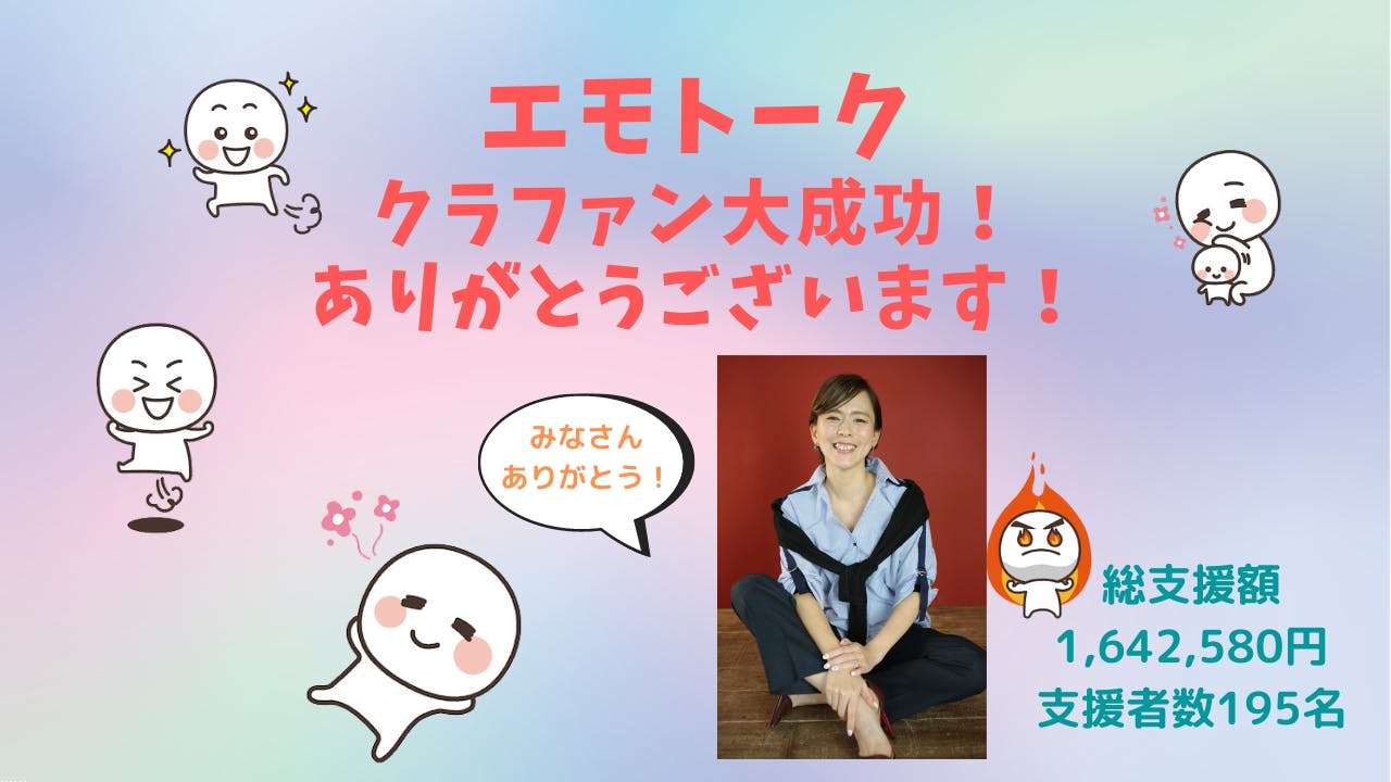 2021/11/30 11:05昨日23:59をもって、「子どもの心を育てるエモトークを広げたい!」のクラファンが無事に終了いたしました!45日間全力で走った結果は1,642,580円という支援額と195名の支援者という感激的なものでした。本当に本当にありがとうございました!ですがこれはここで終わりではなく、今回いただいた支援で作製したエモトークグッズをお届けし、みなさんをさらに笑顔にすること皆さんのコミュニケーションをさらに楽しくすること子どもたちの笑顔を増やすことコミュニケーションに悩む人を減らすことなどなど、わたしたちが描く未来へ向かってこれからも足を止めず前進します!子ども食堂への寄贈は最終的に71セットのご支援をいただけました!!「うちにも送って!」というお声もどんどんいただいております^^また、お届けした際の報告はこちらにてさせていただきますね^^そして、さらにたくさんの子どもたちへ広げて行くためのプロジェクトの企画も始まっています。また皆様のお力をお借りする日がくるかもしれませんが、今はひとまず今回の達成を大いに喜び、リターンをお返ししていきますね^^現在デザインの最終決定段階で、そこから印刷等の工程に入ります。皆様の手元にお届けできるのは、年末か年明けになってくると思います。またリターンの製作状況などもお伝えしてまいりますね^^講座のリターンを選んでいただいた方は、日程調整のご連絡をさせていただきます。エモトークを体験し、ぜひ一緒に盛り上げていっていただけると嬉しいです!^^45日間見守り、励まし、支援をいただきまして、心からお礼申し上げます!本当にありがとうございました!! もっと見る