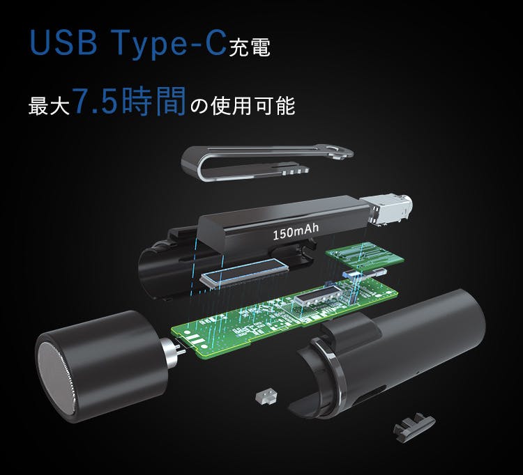 コンパクトボディの中には容量150mAhのバッテリーが内蔵されており、充電を繰り返して何度でも使用OK。