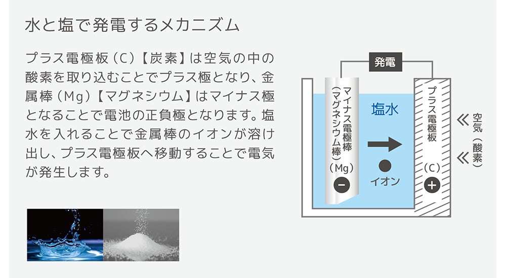 水・塩・マグネシウム(金属棒)・酸素の化学反応を利用し発電。