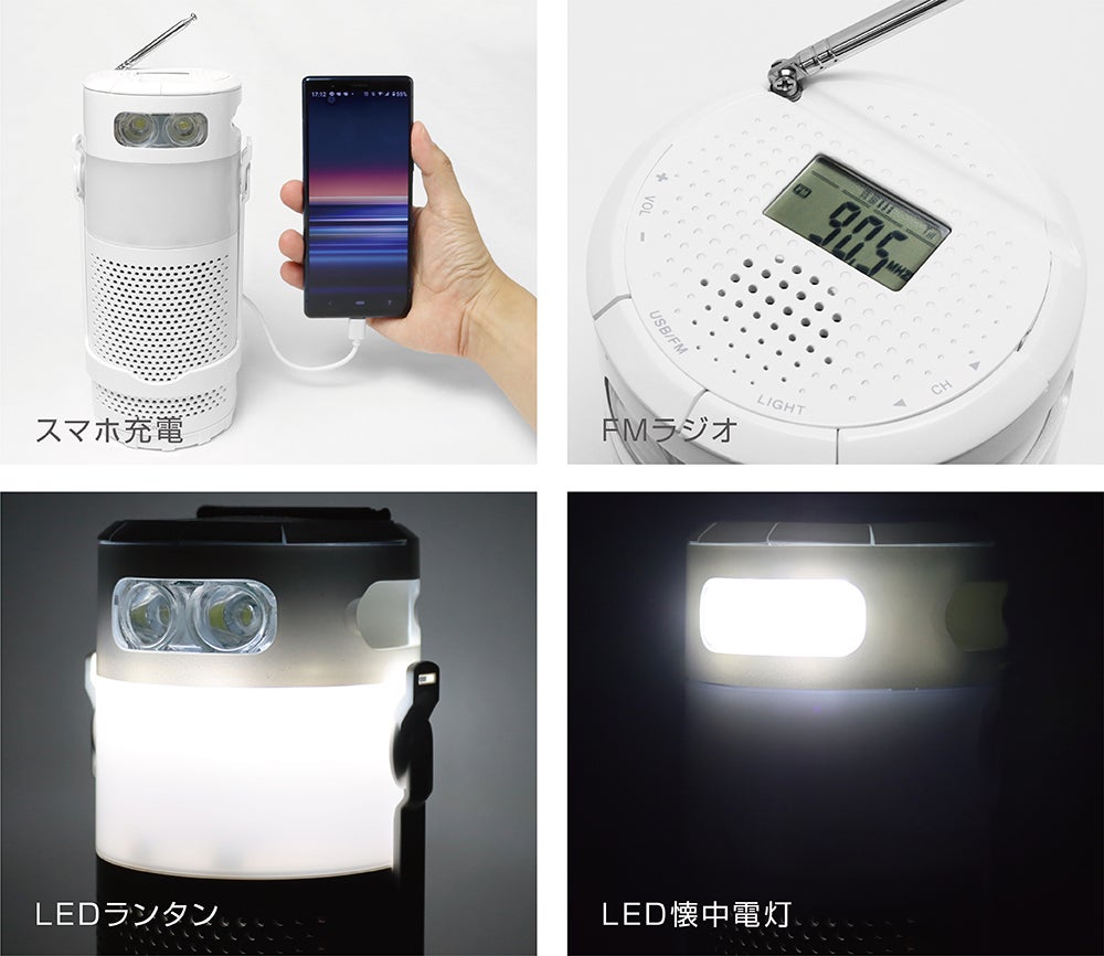 電池や充電設備の限られる災害時でも、スマートフォンの充電・ラジオ・ランタン・懐中電灯の4つの機能をこの1台でまかなうことが可能な仕様となっています。