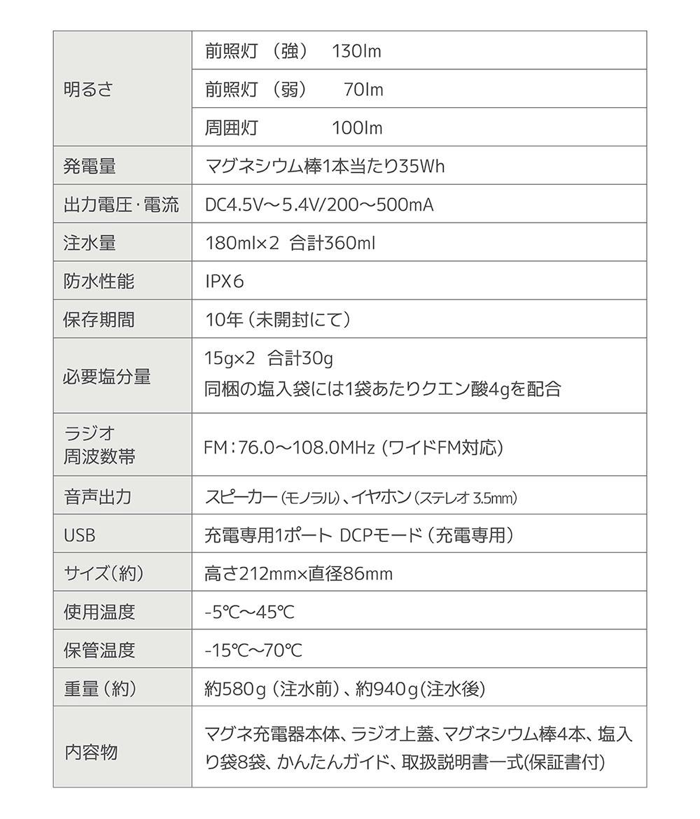 一般的に大きな災害時に救助や支援物資が届くのは約72時間後とされている中、本製品のセットに付属されているマグネシウム棒と塩袋をうまく使用することで、長くみて6日程度は夜間の明かりや携帯電話の電池の確保といった不安要素を排除してくれます。