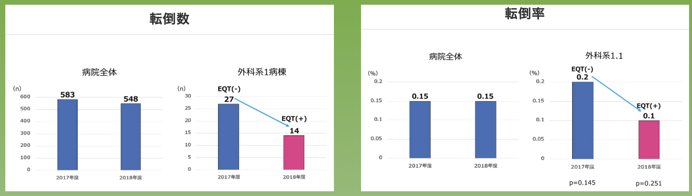 2018年度(12 ヵ月間)延べ人数約12000人に対して、獨協医科大学病院の外科系 1 病棟の入院した患者を対象にEQT 繊維素材を張り付けたリストバンドを着けて入院生活を送ってもらい、装着前(2017 年度)と比較したところ、転倒数・転倒率が減少しました。
