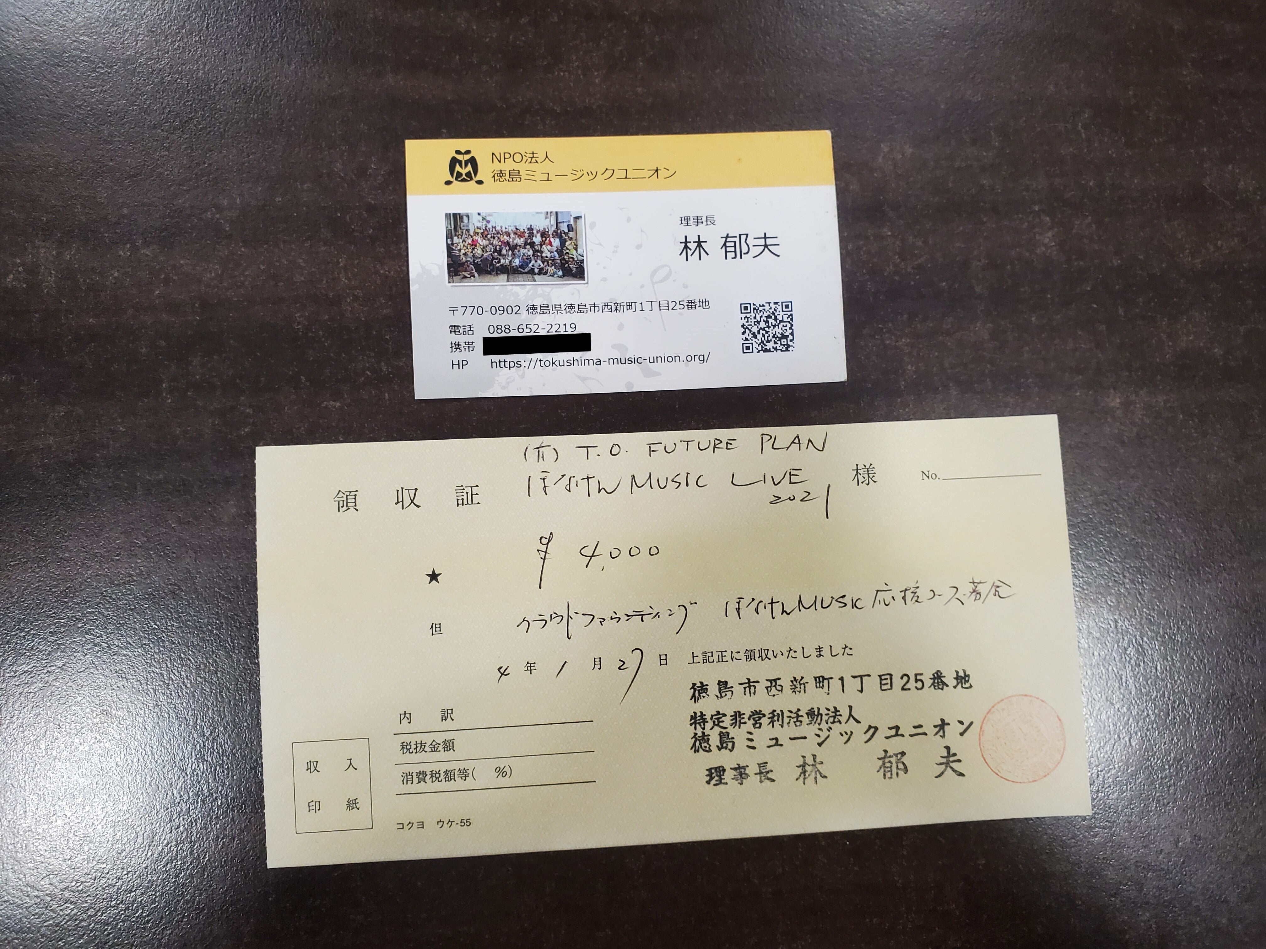 2022/01/28 23:02ほなけん MUSIC LIVE 運営スタッフです。本プロジェクト内リターン〇3000円 ほなけんMUSIC 応援コースに関しまして本コースにおける「徳島の音楽文化団体への支援金」の募金のお渡しの為2022年1月27日(木)徳島市西新町の「NPO法人徳島ミュージックユニオン」代表 林 郁夫様のお店に伺って参りました。https://tokushima-music-union.org/林様は「ひょうたん島しんまち音楽祭」や「とくしま ファミリーバンドフェス」など徳島の地域に根ざしたライブやイベントを数多く企画/開催し、ご自身もジャズプレイヤーとして活動中であり、エフエムびざんではラジオのパーソナリティーも務めております。http://sunnyside.red/index.htmlコロナウイルスの影響によりミュージックユニオン企画のイベントも相次いで延期や中止が続いており開催環境や経済面など、厳しい現状をたくさん語っていただきました。今回のクラウドファンディングの趣旨にご賛同いただき、今後の自社の企画の運営資金として利用していただけるというお約束のもと本プロジェクトの募金を納めさせていただきました!少額ではございますが、このプロジェクトでの募金が僅かでも文化事業存続のための活動や未来の地域音楽の担い手となる子供達への助力のために活かすことができれば幸いです。なお、募金額の詳細につきましては3000円コースの支援金のうち1000円は色紙と発送代、1000円は弊社運営資金、残りの1000円を募金の対象とし、コース支援者4名分 1000円 × 4名分計4,000円を募金させていただきました。 上記コース応募の皆様 この度はご支援 誠にありがとうございました!ほなけん MUSIC LIVE 2021 応援プロジェクト 運営スタッフより もっと見る