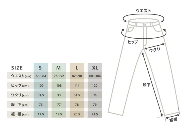 ・製造誤差及び測定誤差により、記載のサイズや重さと誤差が生じる場合がございますが、製造の都合上避ける事ができません。なお、「Fisherman's Denim Workpants|KIGEN」および「Fisherman's Denim Workpants|KAKUSHI」は縫製後に撥水等の加工を行うため、通常より大きな製造誤差が生じる可能性もございます。