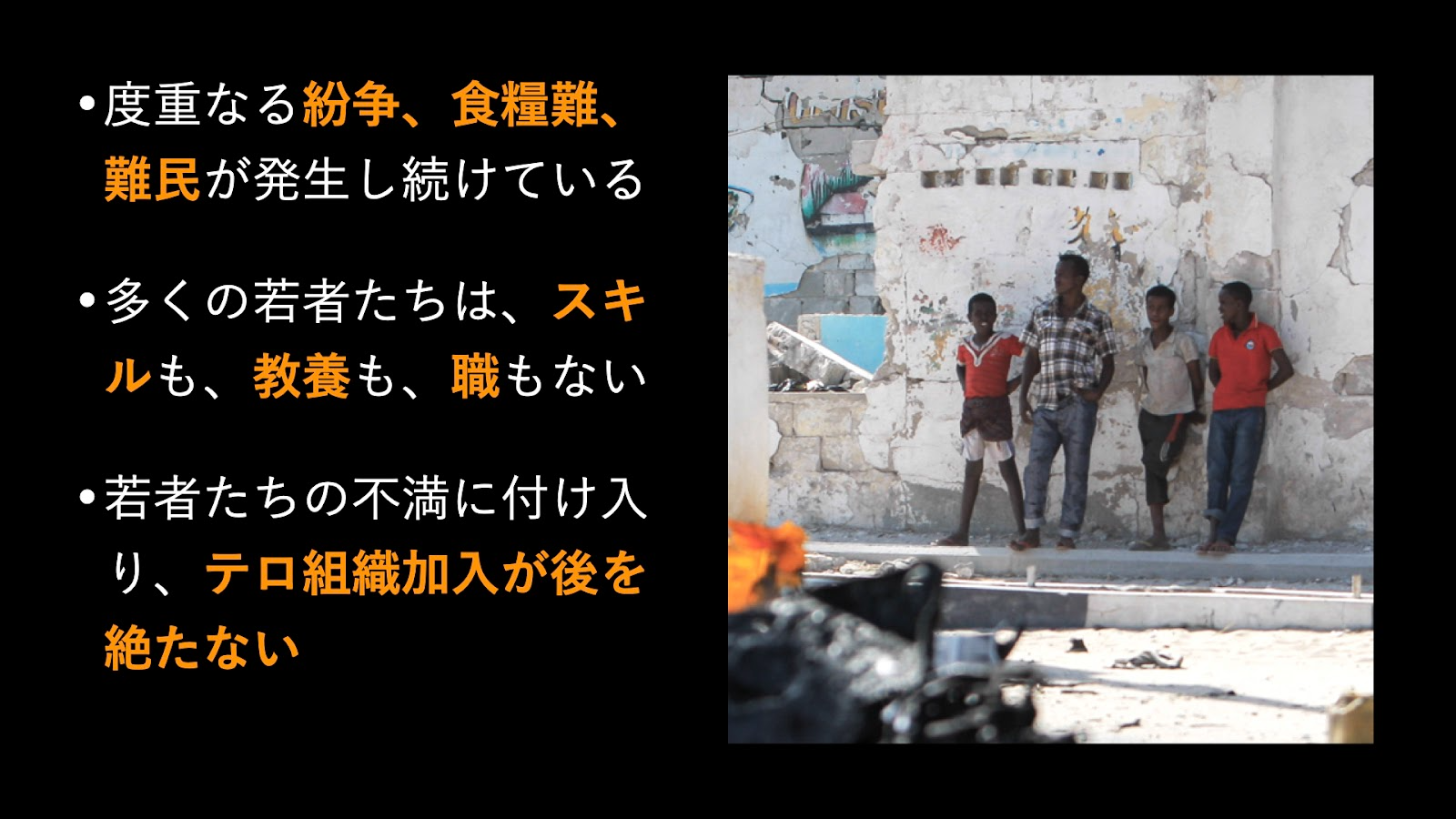 紛争、干ばつ、飢餓という絶望的な環境を生きる多くの若者たちには、スキルも、教養も、職もありません。過酷な状況下にある若者の怒りや不満に付け入り、組織加入への勧誘を行うテロ組織も絶えません。その結果「今の生活を変えたい」「貧困から抜け出したい」と自らテロ組織への参加を決意してしまう若者たちは少なくありません。