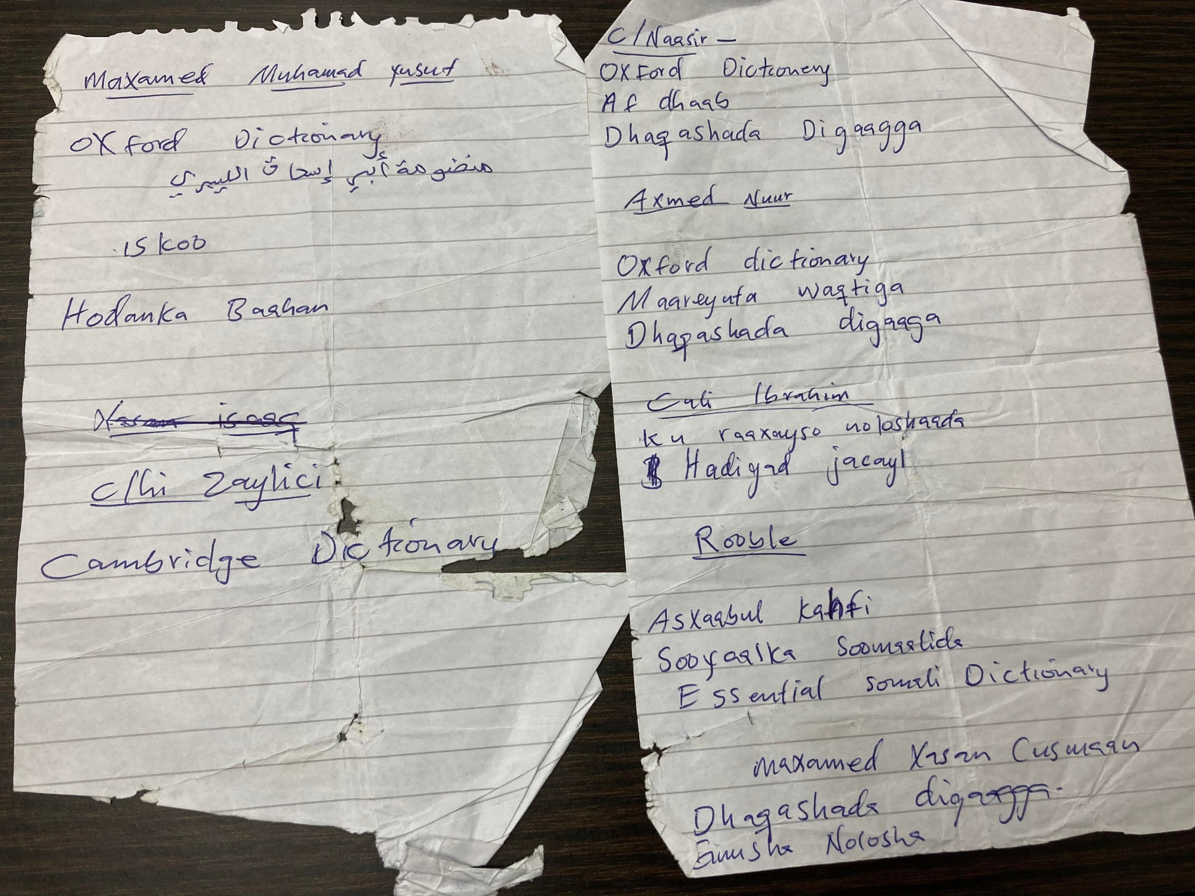 (画像:実際に刑務所の若者からあった本のリクエスト、英ーソマリ語辞書のリクエストが多く、中にはビジネス関連の本や、ニワトリの買い方などがソマリア語で書かれてます。)