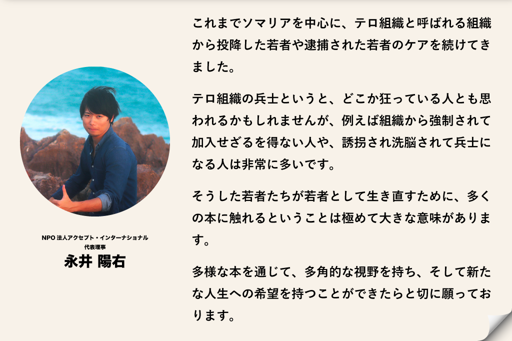 NPO法人アクセプト・インターナショナル代表理事である永井陽右さんはこの図書館プロジェクトの意義について語っています。