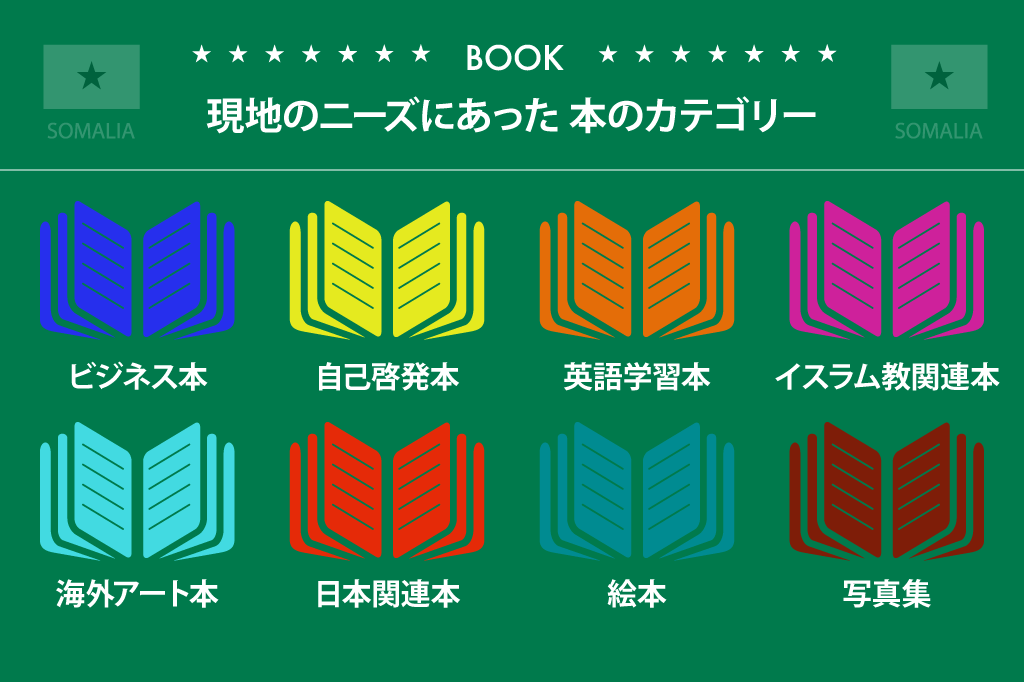 ソマリアクラスコーディネーターの永井さんと打ち合わせを重ねて現地のニーズにあった本のカテゴリーを8つ選定しました。