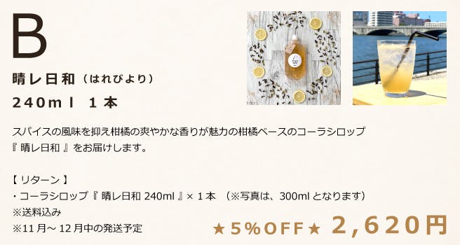 コーラシロップ 『 晴レ日和 (はれびより)』は、柑橘の風味を効かせスパイスの味を抑えた飲みやすいクラフトコーラで、スッキリした後味の爽快感が楽しめるクラフトコーラです。
