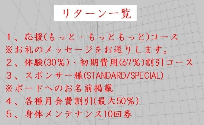 ジム内掲示のスポンサーボードに「Special thanks」として、お名前(ニックネーム可能)を掲載させていただきます。