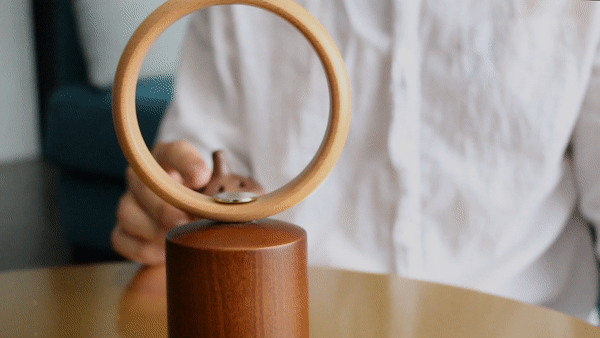 A3.動作音はほとんどありません。コマ部分(どんぐり部分)と木製リングの間を調整することで回転中の音をほとんど出なくすることができます。