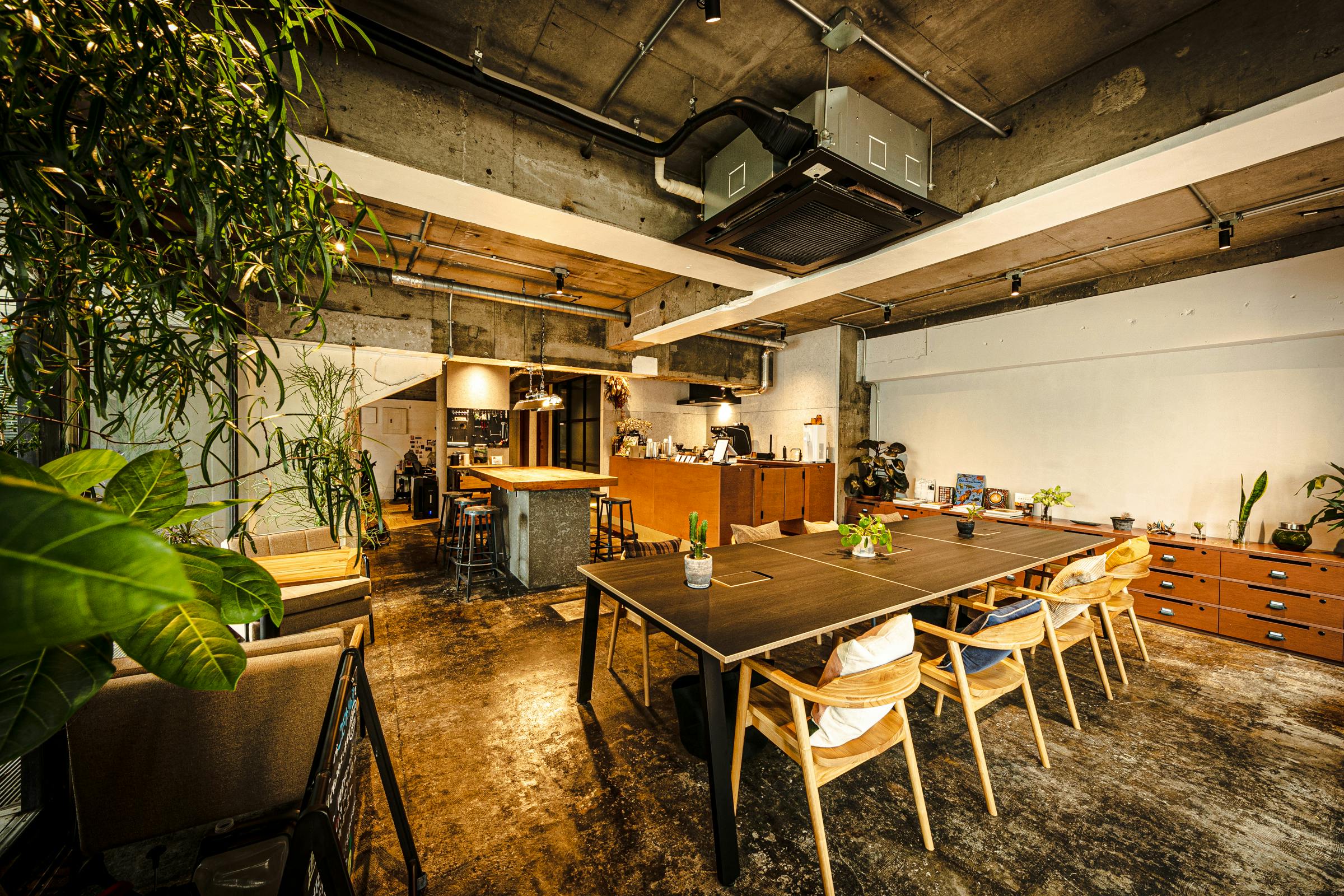 ダークブラウンの木目調の大きなテーブルと鮮やかなグリーンが目を引きます。