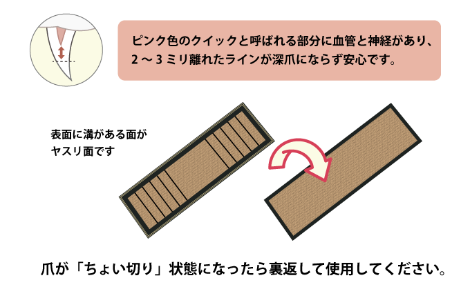 ヤスリにはクッション性があるため爪にフィットし、爪先がやさしく削れます。