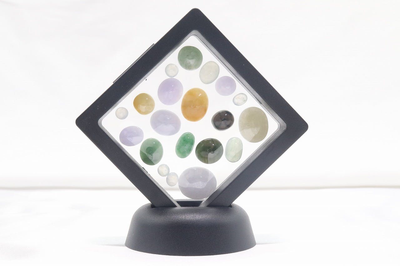一般的な緑翡翠以外に赤・黒・黄・ラベンダー・氷翡翠を詰め合わせいたします。色・形・大きさはランダムで決定いたしますが、出来る限り色々なカラーを組み合わせし、合計80ct以上は保証いたします。