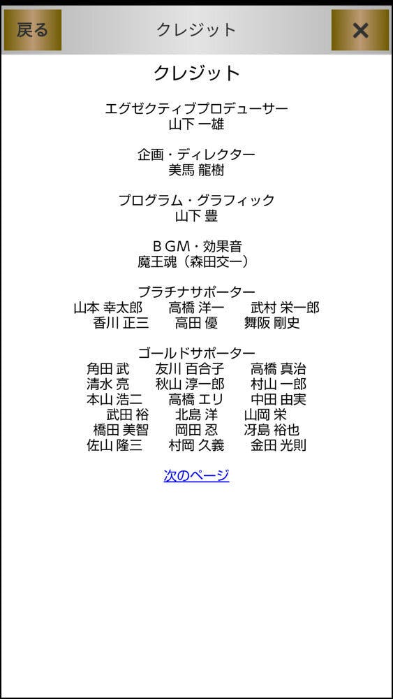 クレジットは、Webページに名前を書いたものをゲーム内で表示する仕組みになっているため、1ページ目、2ページ目、3ページ目、という風にわかれています。