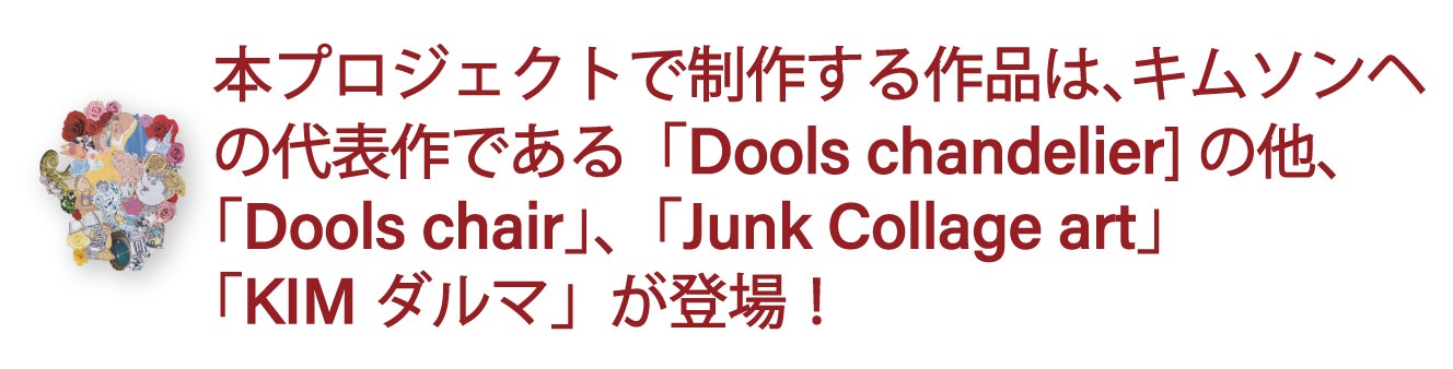ぬいぐるみやアメリカン・トイ、達磨や招き猫、熊手といったアイテムを独自の「ジャンク・コラージュ」と評されるこうした手法 で制作され、一見ごちゃごちゃな「ジャンク」であるようでいて、その世界は奇妙なバランスで均衡を保っているキムの作品群。本プロジェクトで制作する作品は、キムソンヘの代表作である「Dools chandelier(ドールズシャンデリア)」の他、「Dools chair(ドールズチェア)」、「Junk Collage art(コラージュアート)」「KIMダルマ」が登場し、まさに行き場を失ってしまったおもちゃたちや何気なく飾っているぬいぐるみに新しい命が吹き込まれ、人々が集まる明るい場所の象徴となる作品に生まれ変わります。