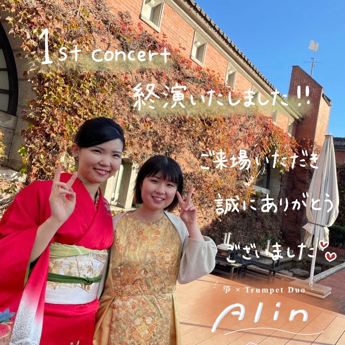 2021/11/25 19:00〜箏×Trumpet Duo Alin 1st Concert〜無事に終えることができました!想像を遥かに越えた数のお客様にご来場いただき、大変嬉しく思っております。屋外のステージということで、強い風と寒さに見舞われ、トラブルもございましたが、お日様は1st Concertを聞きに来てくれたようでした☀(雨天を懸念しておりましたが、晴れてよかったです笑)ご来場くださいましたお客様はじめ、会場設営、宣伝広告、クラウドファンディング、当日のお手伝い等、沢山の方のご尽力の元、本日コンサートを行うことができました。携わってくださったすべての方々に、改めて御礼申し上げます❁私達の夢…大好きな地元で、コンサートを開くこと!このような形で実現できて、嬉しすぎてなりません…次回は香川県で!6月中旬に、2nd Concertを予定しております!詳細は、後日お知らせいたします☕︎皆様に感謝の気持ちを忘れず、次に向けて日々精進して参ります!!今後共、応援していただけますと幸いです ⸝꙳宜しくお願い申し上げます☺︎鈴木泉芳、有馬沙彩 もっと見る