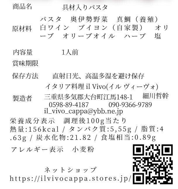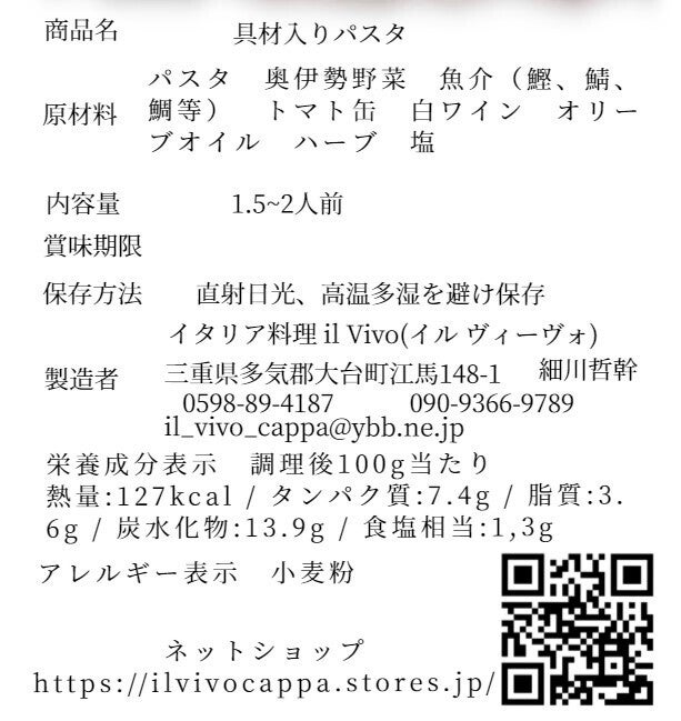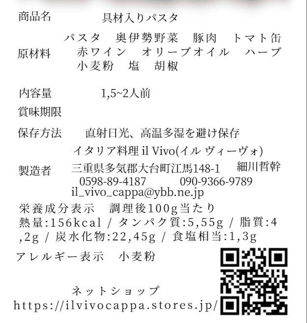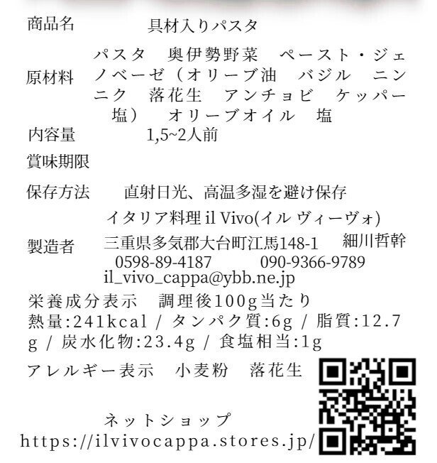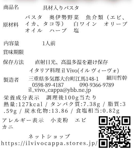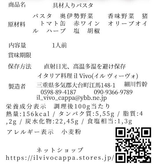 これらのパスタには”ドライ奥伊勢野菜”(ほとんどが有機無農薬栽培)がたっぷりと入ります。
