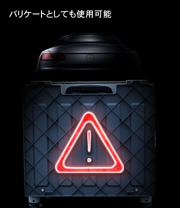 蓋の内側に警告用マークがついており、緊急時に一時停車してキャリカートを置いて、道路コーンの代わりにバリケートとしても使用可能です。