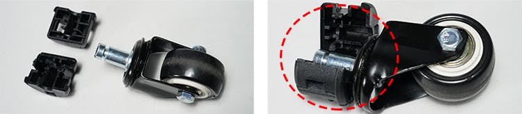 ・輸送中、キャスターのカバーが外れるときがあります。不良ではありません。下図のようにキャスターに装着してご使用ください。