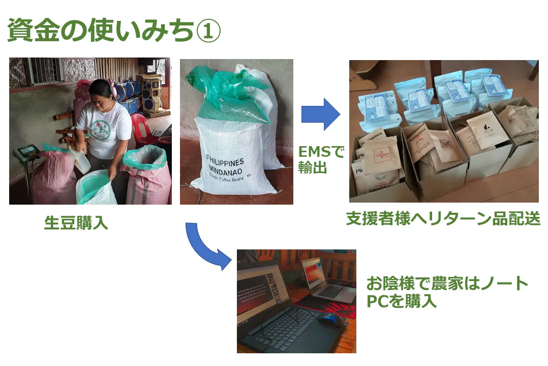 マグカップ、Tシャツ、焙煎豆 、コーヒー生豆を支援金から購入し支援者様へ配送させて頂きました。当初、焙煎豆のお届けにかかる費用は想定を超過しました。