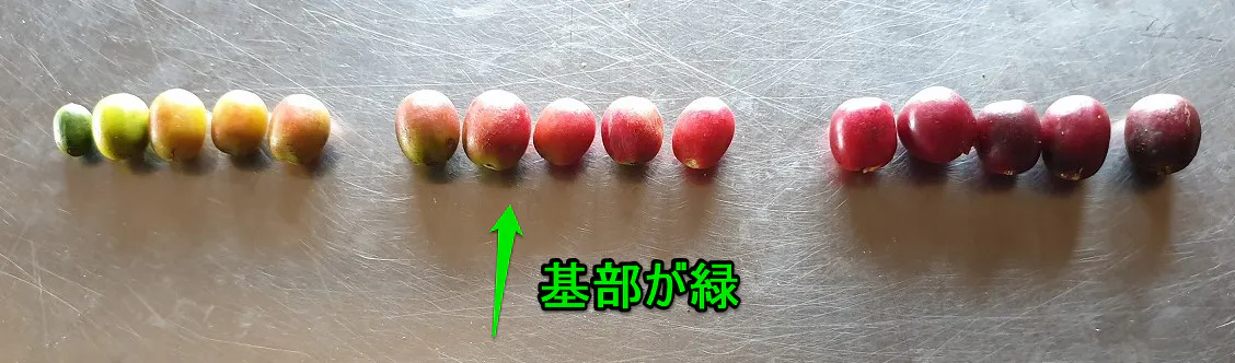 2020年から赤色の果実収穫をやめて完熟(濃赤または紫色)果実をなるべく摘むように決めました。赤い果実もひっくり返せば裏側が緑色だったりとバラツキがあるためです。
