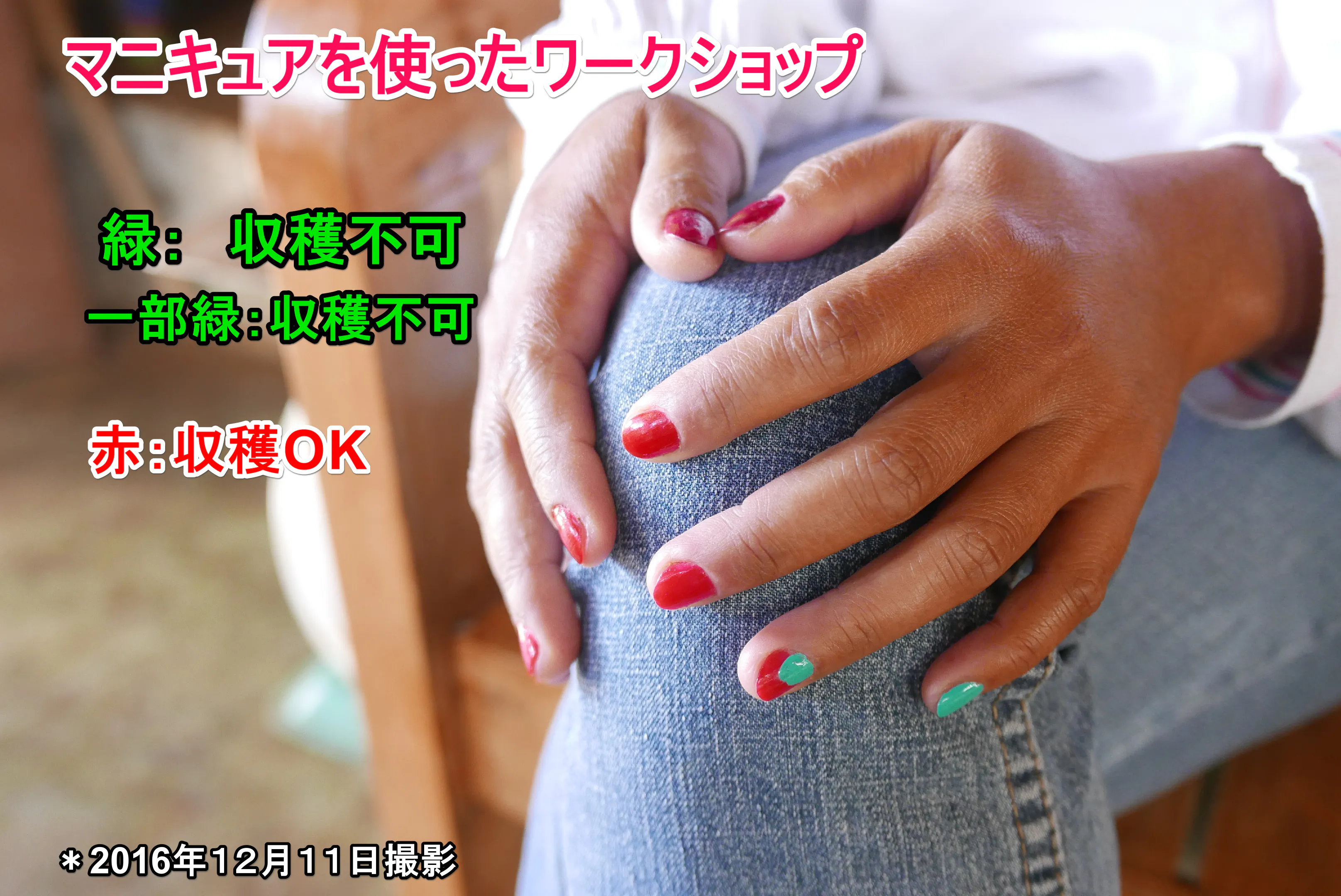 緑色の果実は収穫しないように、2016年から指導。下は、以前に100円均一ショップでマニキュアを買って農家の女性に緑は収穫NG、一部緑も収穫NG、赤は収穫OKとワークショップをした時の様子です。