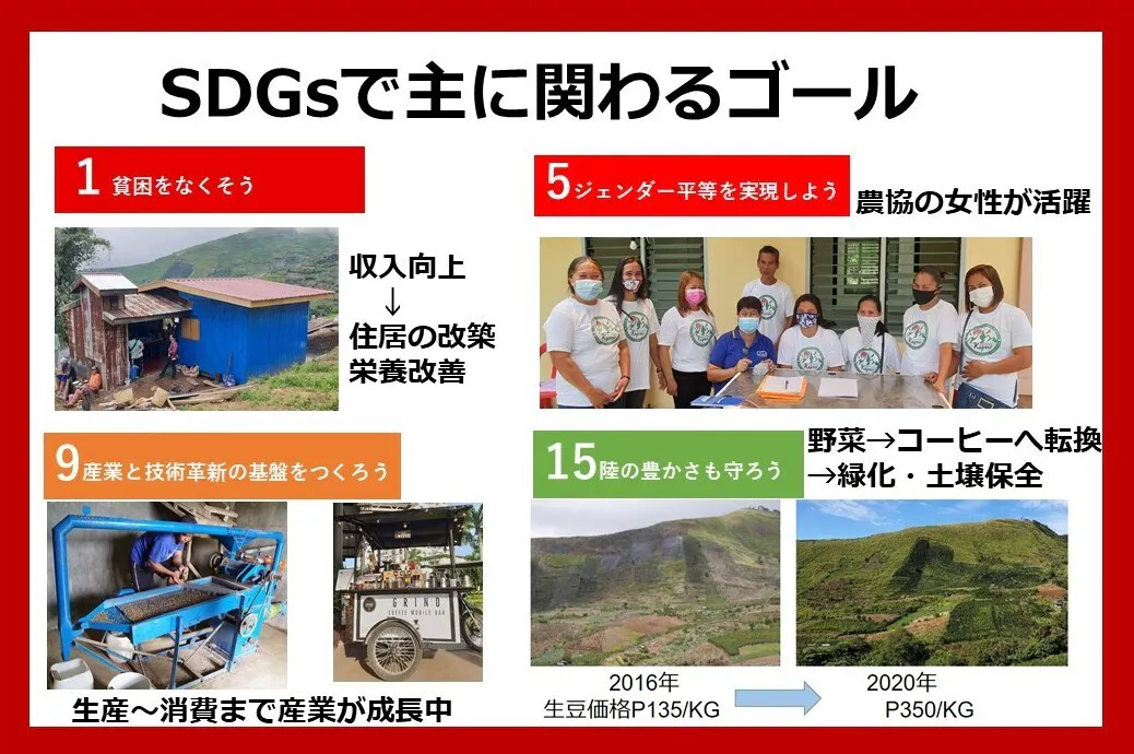 ・陸の豊かさを守ろう → コーヒー樹で山の緑が回復。土壌保全効果。