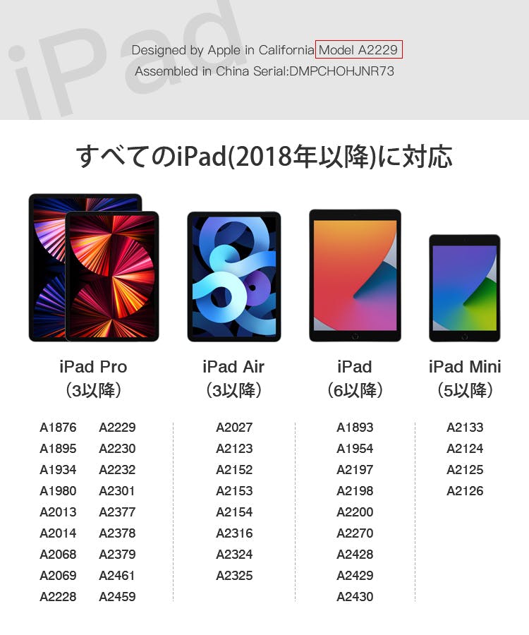 2018年以降に発売されたiOSバージョン12.2以降に対応しています。使用しているiPadが対応しているか、本体背面に刻印されているモデルをご確認ください。