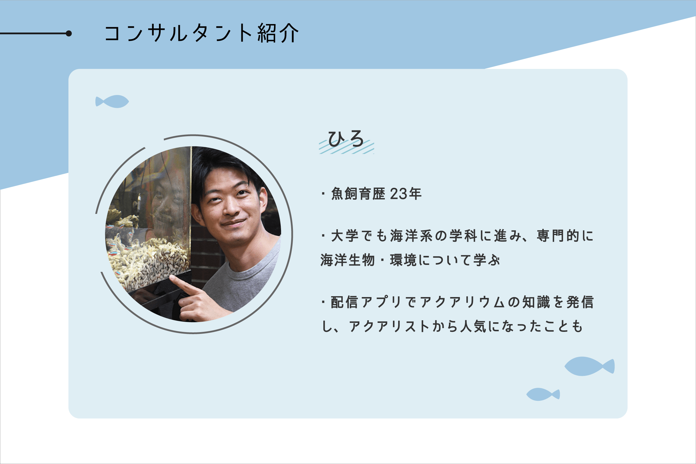 さらに、現役で塾講師&家庭教師もしています。あらゆる生徒の道を切り開き、過去に所属していた会社の上層部で有名人になったほどの実力の持ち主です。コンサルタントとしてもその腕を発揮し、あなたの理想のアクアリウムライフに向けて的確に、優しく・楽しく・わかりやすくサポートしてくれること間違いありません!