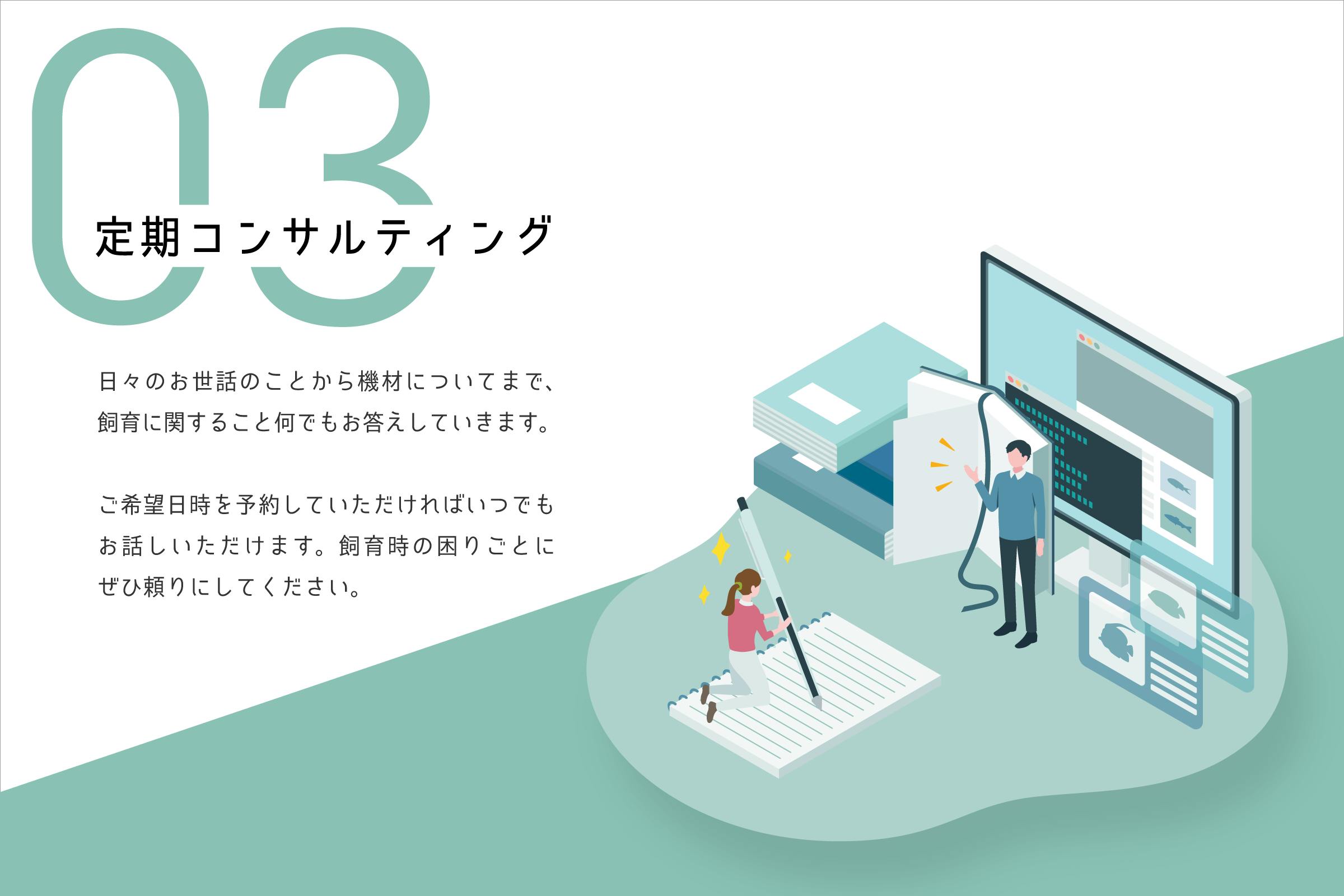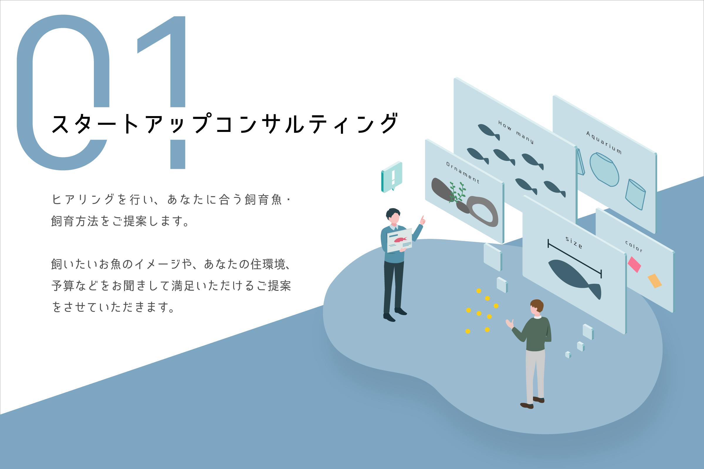 今回のプロジェクトである、「アクアリウムコンサルティング」の内容をご紹介します。快適にお魚を飼育していただけるように、3段回のコンサルティングでサポートを行います。