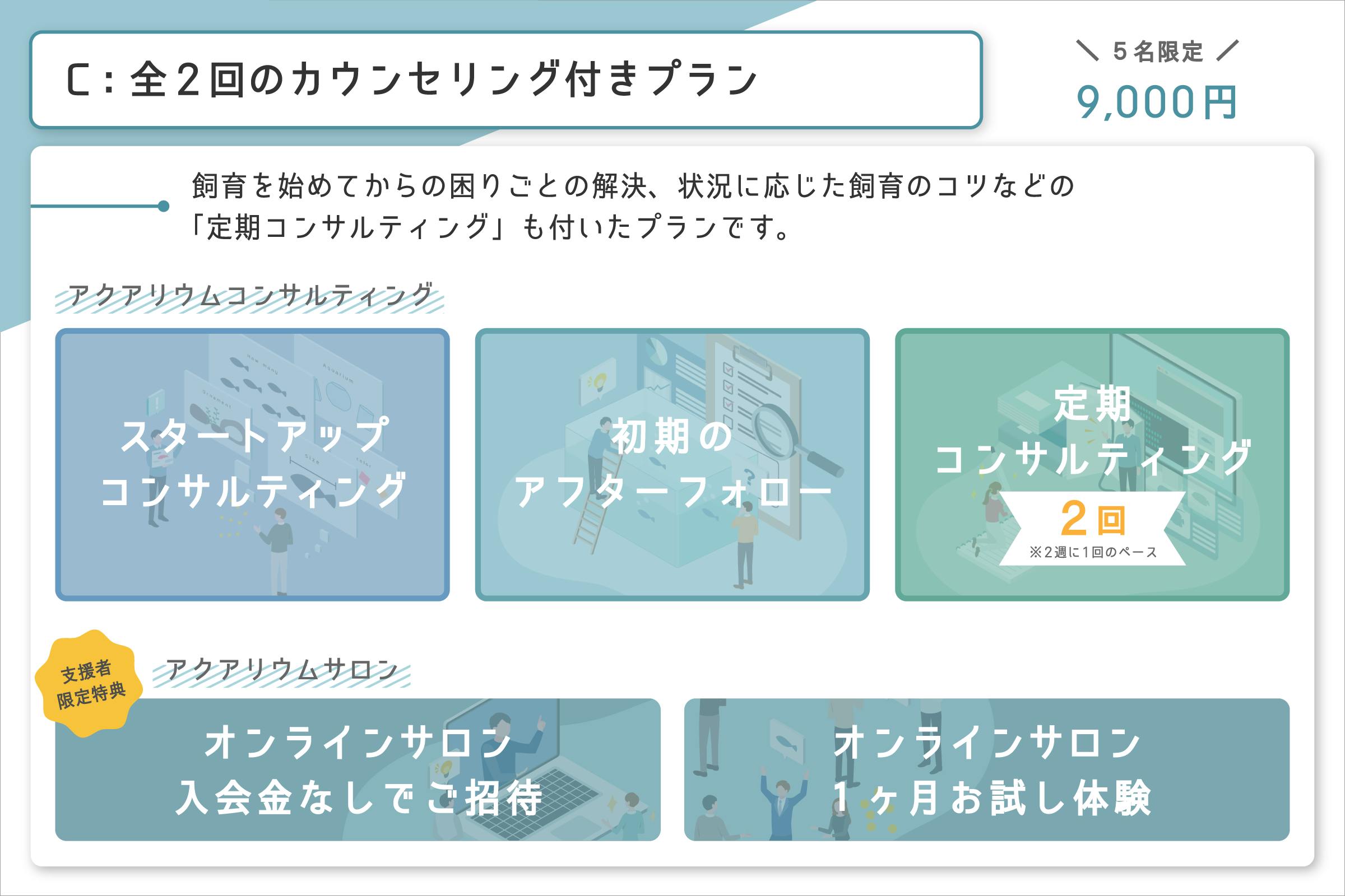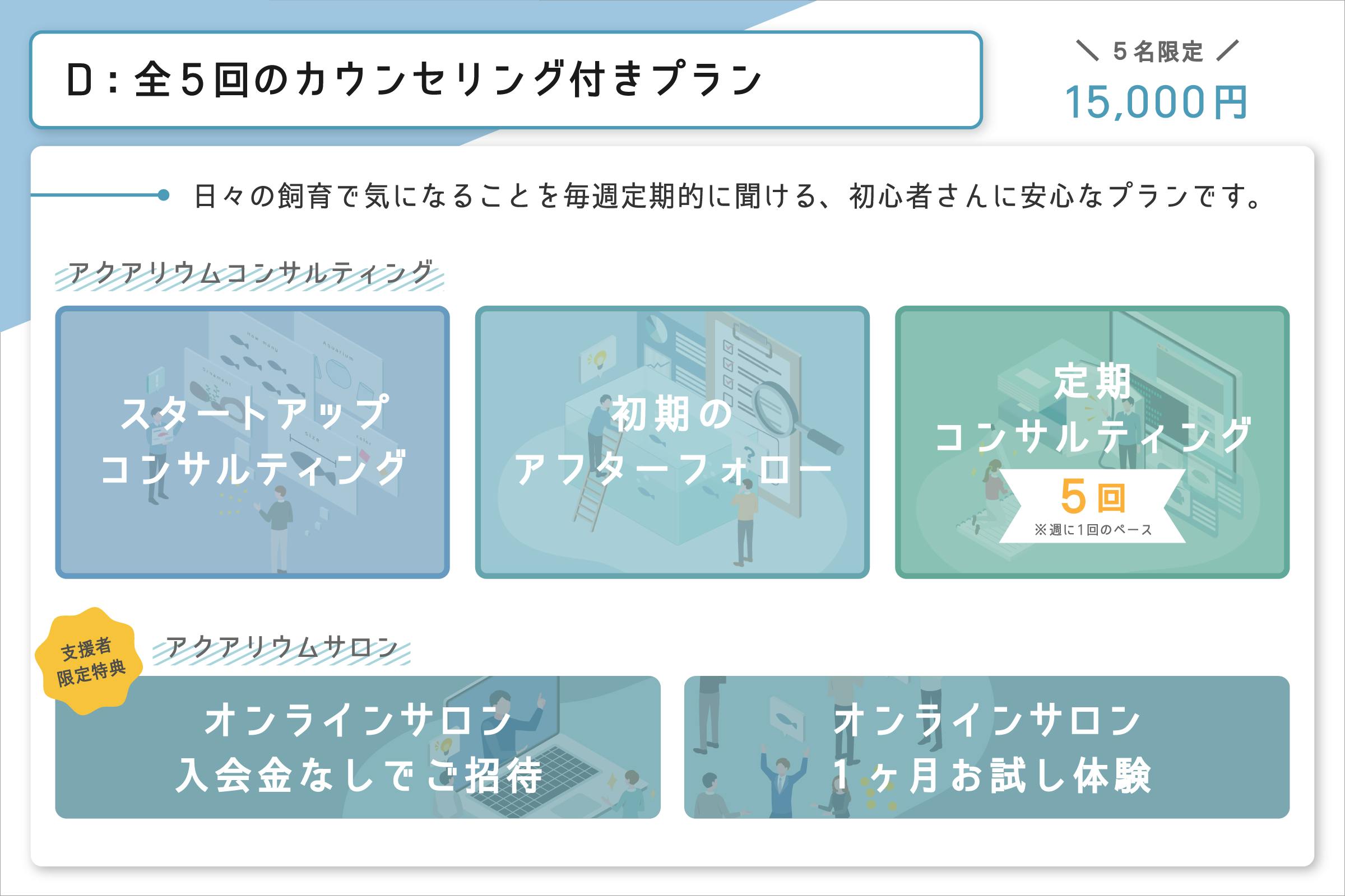 1.「アクアリウムコンサルティング」の「①スタートアップコンサルティング、②初期のアフターフォロー、③定期コンサルティング5回」を受けられるプラン