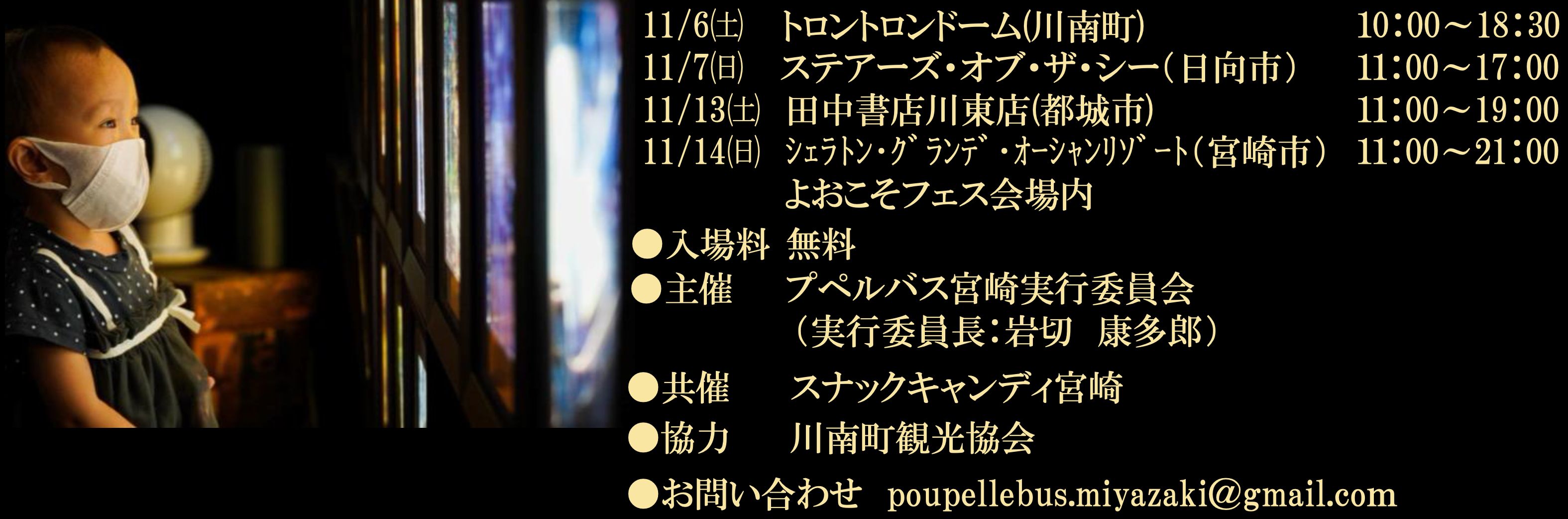2021/11/12 00:00こんばんは、岩切です。プペルバスin宮崎。早いもので、開催日程も残すところあと3日となりました。今週、月曜日からバスは「川南中央保育園」「多賀小学校」「山本小学校」「川南小学校」「多賀小学校」「通山小学校」と、町内の小学校を回りながら子供たちに笑顔を届けています。明日(金)の会場は僕の母校でもある「川南東小学校」です。学校の隣にある東保育園の子供たちにも声を掛けてくださっているそう。実は、今回、プペルバスが町内の全小学校を回れるようになるきっかけを作ってくれたのは、この東小学校の荻原校長先生のお陰なんです。東小学校が他校に先駆けて、学校での開催に手を挙げてくださったことで他の小学校にもその動きが広がりました!荻原校長先生、その節は本当にありがとうございましたm(_ _)mそして、イベントラストの週末は、13日(土)田中書店川東店(都城市)←日没後にプロジェクションマッピングが見れるかも。14日(日)シェラトンホテル(宮崎市)(よおこそフェス会場内にて同時開催)←こちらはプロジェクションマッピングはありません。ご都合の合う方はぜひ会場までお越し下さい!スタッフ一同、お待ちしております♪ もっと見る