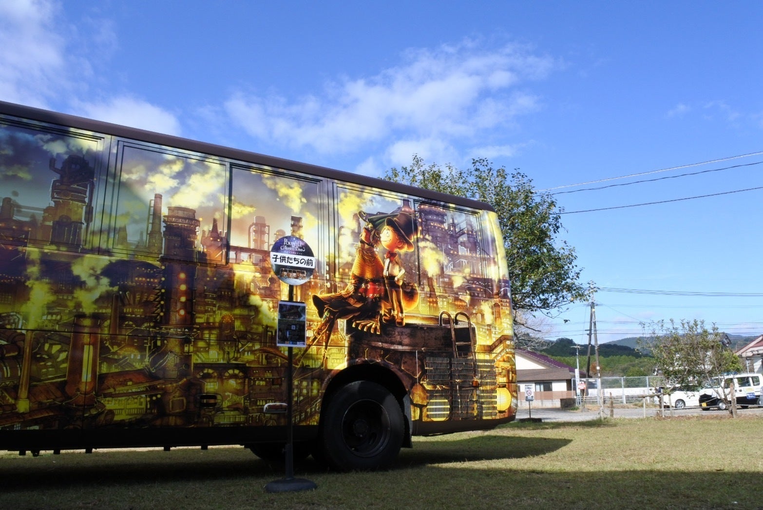 絵本「えんとつ町のプペル」の世界(絵本の挿絵)を光るパネルにして展示した“光る絵本展”を、「個展会場に足を運べない子供達の元にも届けたい」と思った大阪の山口修平さんが、バスの中にパネルを展示した移動式個展会場です。