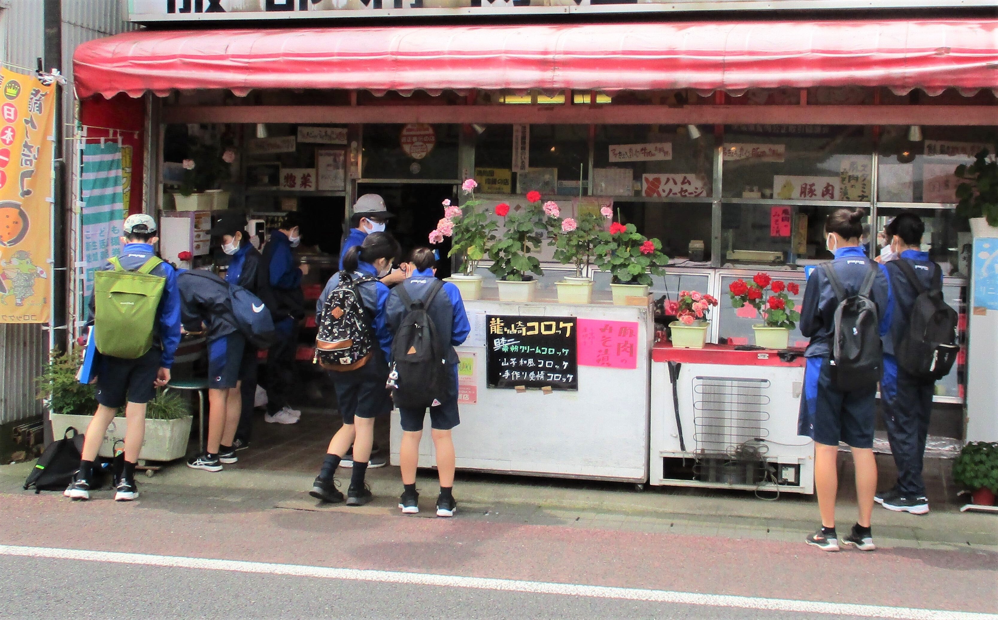 コロッケ店・関東鉄道竜ヶ崎駅員にインタビューする竜ヶ崎第一高等学校附属中学校2学年の生徒