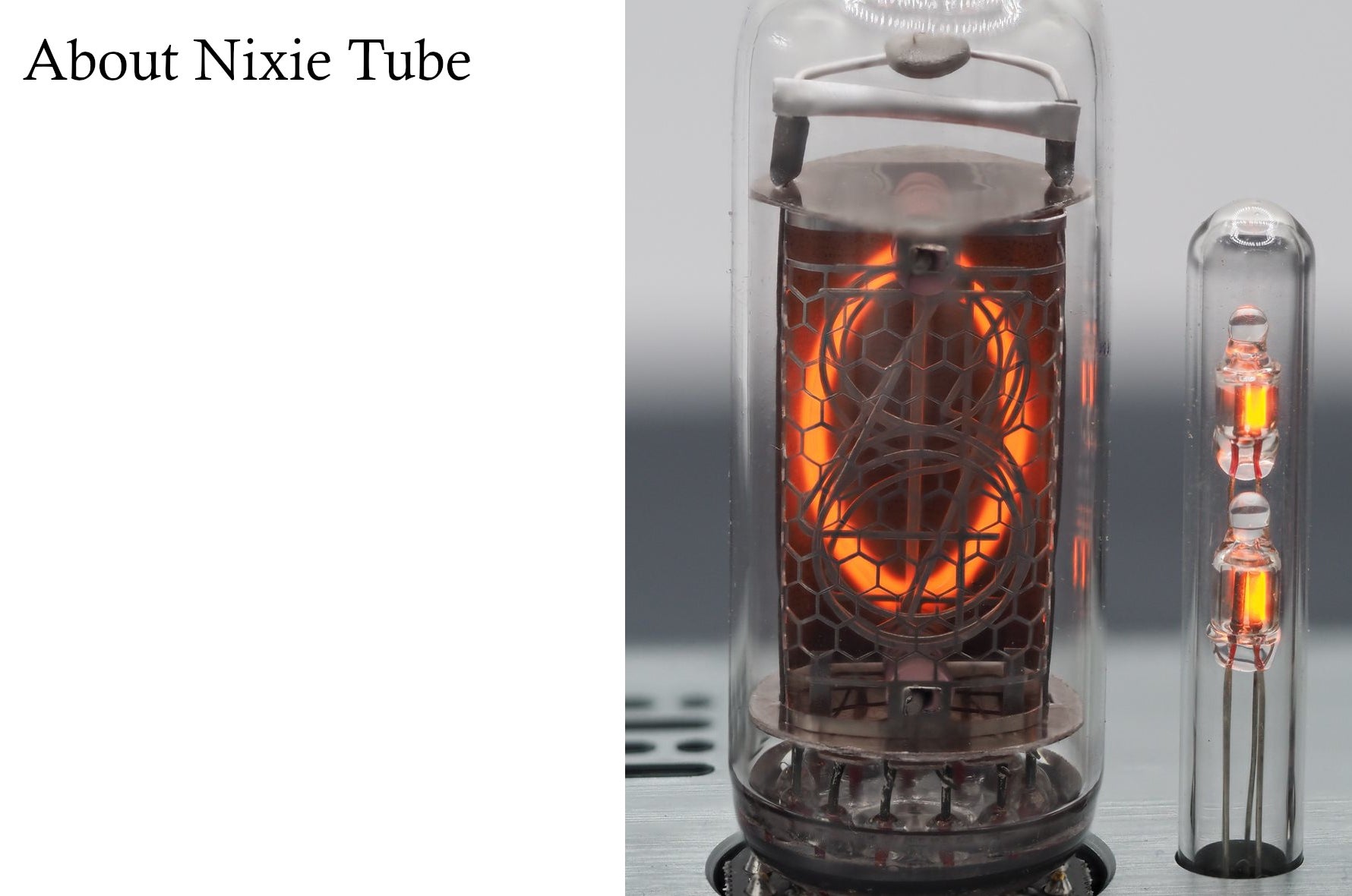 ガラス製で、数字あるいは文字などの形状をした多数の陰極と1つのメッシュ状陽極から構成され、内部は少量のアルゴンあるいはさらに少量の水銀を添加した0.15気圧以下のネオンガス(放電電圧を低くするためのペニングガス)で満たされているものです。