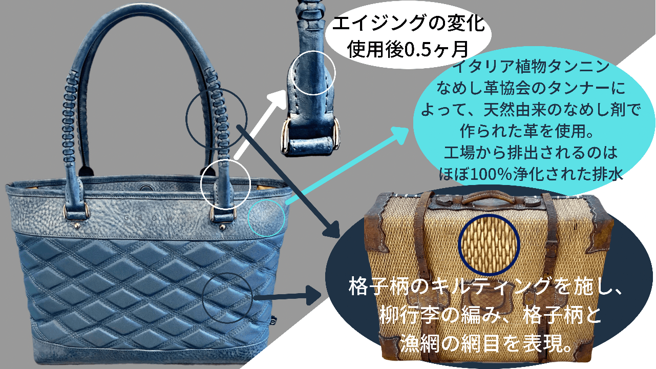 海洋が抱える問題に対してアップサイクルという形でコミットし、革の経年変化を存分に愉しめ、所有する事の意義を感じられる『GROW 育てる鞄 AGING TOTE for the Blue』