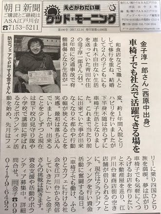 2017/12/17 14:42流山おおたかの森防災フェア2017 これは↓朝日新聞の担当記者さんに教えてもらった「防災フェア」の時の写真です。 ここでたくさんの方とお会いして、 私のクラウドファンディングのチラシを配るなどして一気に人の輪が広がっていきました。 最近ではシャンソン歌手の高森さんやPTA会長の中川さんと出会うことが出来ました。 ほかにも糀マイスターの先生と店の糀料理(漬物や焼物など、流山市はみりん発祥の地なんです)を考えたり、朝日新聞記事を読まれて連絡して頂いた方も多く、ある方とは週明けにお会いして、お話を伺います。 数日後には市会議員、県議会議員の方ともお話しするお約束を頂きました‼ このように、たくさんの方のおかげで私は動いてこれました。 ここまで読んで頂いている皆さんや このプロジェクトを支援してくださった方々のおかげで 私はここまで動いてこれたのです。 心から感謝しています。 本当にありがとうございます! さあ、もう残すところ1週間ほど。 あとひと踏ん張り! 諦めはしませんよ! 頑張るぞぉ~~~っ!!! もっと見る
