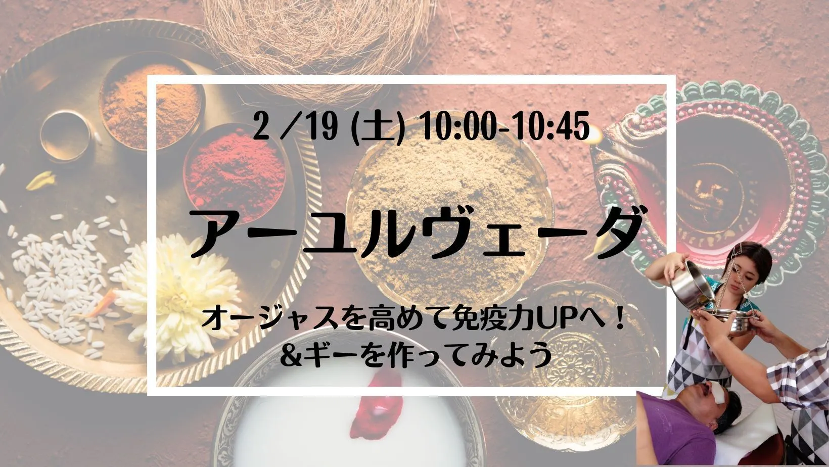 オージャスを高めて免疫力アップへ!&ギーを作ってみましょう。アーユルヴェーダで免疫向上を語るにおいて意識したいのはオージャスの概念です。オージャスとは「生命力」のこと。このオージャスが沢山ある人は、肌艶がよく、生き生きといつも元気があり、心も体も免疫力が高まった状態!講座の中ではオージャスを高める為の簡単なケア方法をお伝えします。また、アーユルヴェーダの中で最高のオイル、そしてオージャスを高めるものとされているギーの作り方もレクチャーします。ぜひ一緒にギーを作りましょう!