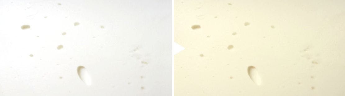 ●メモリーフォームに生じる小さな気泡は、原料を金型に注入するときに発生する気泡が上がってきて生じる自然な現象です。機能上は全く問題ありません。また、時間の経過ととも黄色に変色する現象も同様に、自然な現象で機能上は全く問題がないので初期欠陥に該当しません。