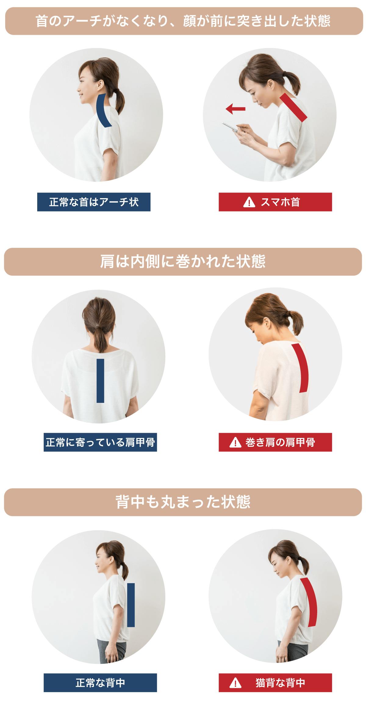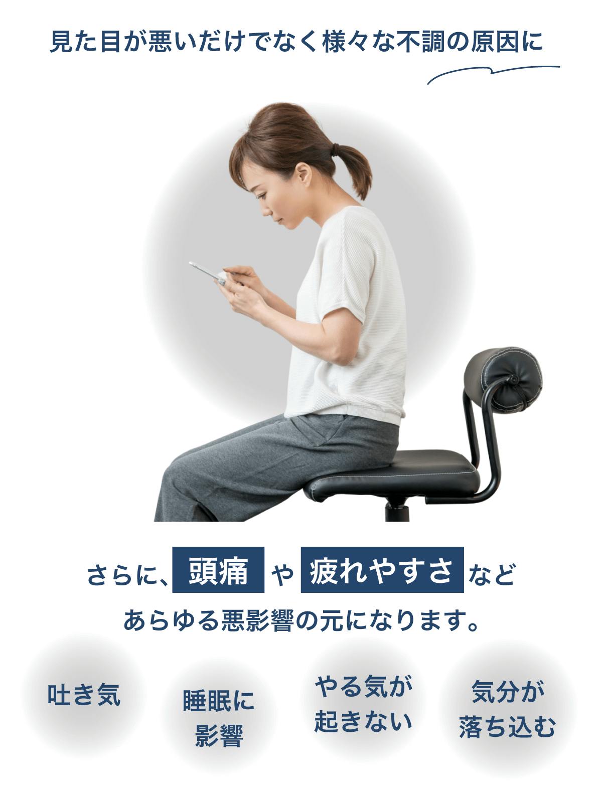 この姿勢を数カ月、数年と積み重ねていくと、気づけばカラダは猫背、巻き肩、ストレートネックに。首や肩、背中の負担はさらに増すのです。