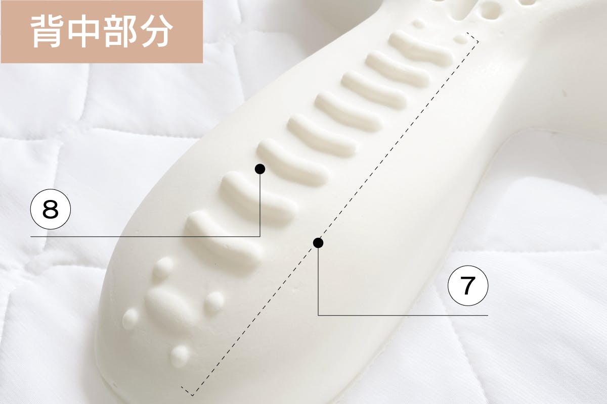 寝ている間の多くの時間を首、肩、背中の姿勢教育にあてられるように、あえて横向きになりにくいようにデザインされています。もちろん、寝返り・横向き寝も出来るように、少し動けるようデザインされていますので、ご安心ください。