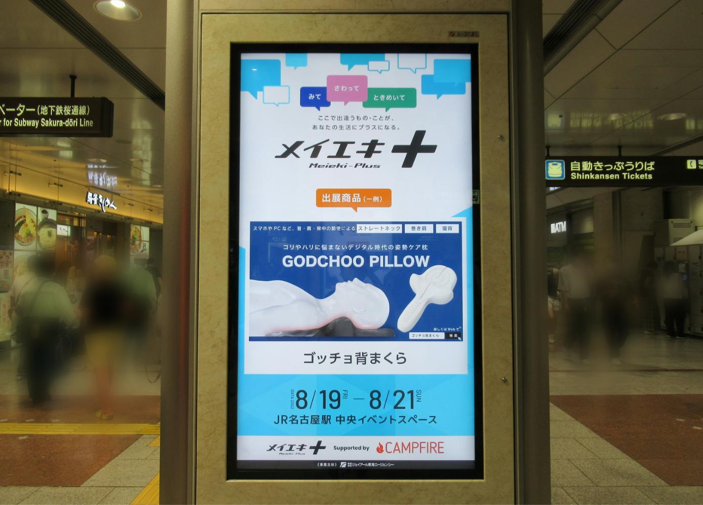 2022/08/19 17:01こんにちは!ゴッチョ背まくらプロジェクトの岩上です。今回はゴッチョ背まくらの中部地区初進出のお知らせです。名古屋駅構内の期間限定体験型Storeにゴッチョ背まくらを出店します。<<「メイエキ+」Supportedby CAMPFIRE詳細>>開催日程:2022年8月19日(金)~8月21日(日)開催時間:10:00~20:00(初日は12:00スタート/最終日は19:00まで)開催場所:JR名古屋駅中央コンコース イベント広場詳しくはこちらからhttps://www.jrta.co.jp/event/nagoya/駅の構内ではサイネージ広告も流れています。そして、今朝の中部経済新聞さんの朝刊にも記事を掲載頂きました。ベッドも常設しておりますので、名古屋近郊にお住いの方はぜひ1度試しにきてください。名古屋駅で皆さまのお越しをお待ちしております! もっと見る【ゴッチョ背まくらの正しい使用方法】二日目の使用方法について。