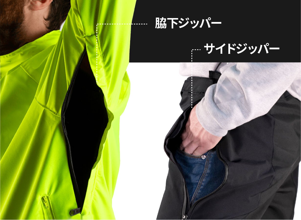 「脇下ジッパー」は蒸れを逃がせるばかりか、レインジャケットで煩わしいトイレの際に簡単着脱できる「パンツのサイドジッパー」も搭載。