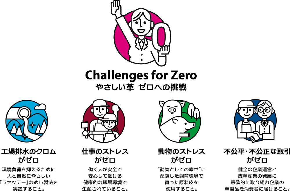 すべての豚にしあわせを送る取り組みは、「4つのゼロ」として提起。この趣旨に沿って育てられた豚を、環境や働く人に配慮して食肉や革に加工、プロダクツとして皆様のお手元へ届けます。